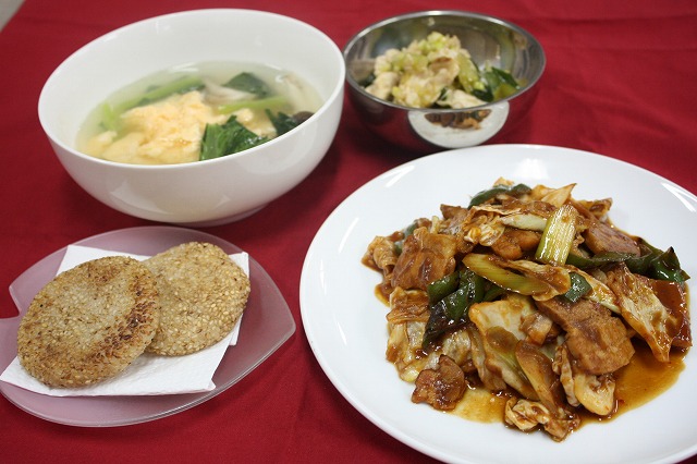 回鍋肉、鶏のささみの和え物、玉子スープ、簡単ゴマ団子