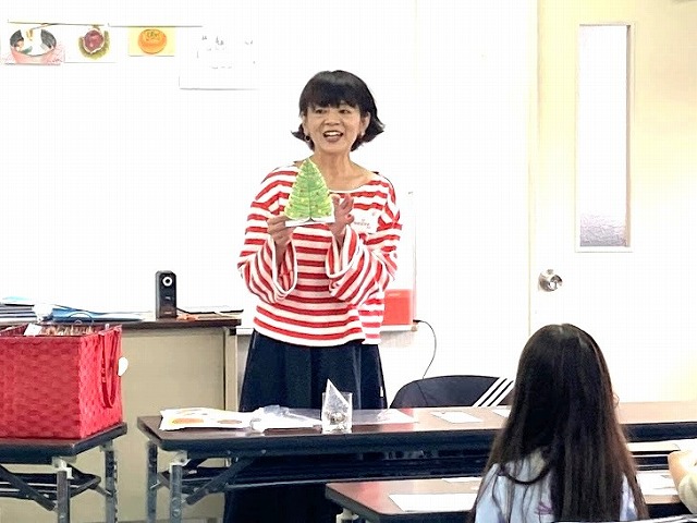 「クリスマスツリーを書く」「季節」をテーマに、色の塗り方、選び方等を学。