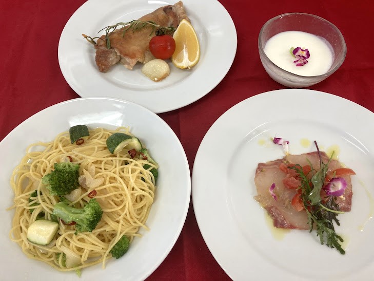ペペロンチーノ、魚のカルパッチョ、チキンのソテー、パンナコッタ